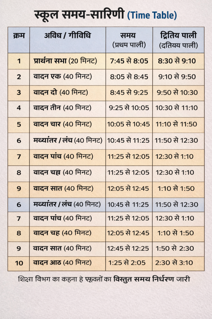 जारी निर्देशों के अनुसार प्रार्थना सभा 20 मिनट की होगी। इसके बाद अलग-अलग पीरियड 40-40 मिनट के निर्धारित किए गए हैं। विद्यालयों में सुबह की कक्षाएं प्रातः लगभग 7:45 बजे से प्रारंभ होकर दोपहर बाद तक संचालित होंगी। मध्यांतर का समय भी तय किया गया है, जिससे शैक्षणिक अनुशासन बना रहे।
